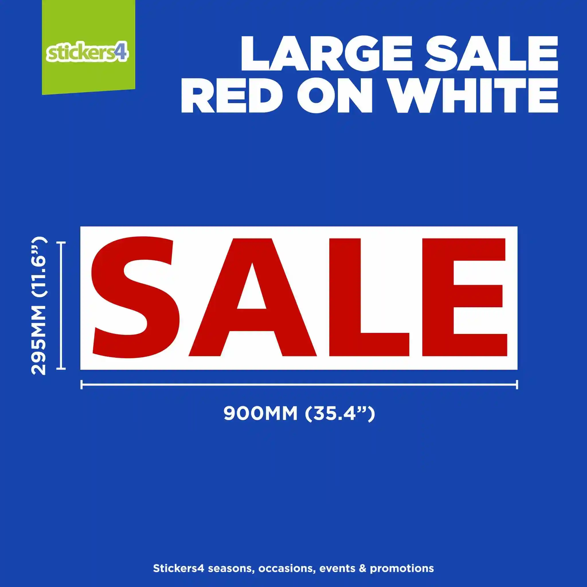 A large reverse printed static cling window sticker / decal measuring 900mm x 295mm. The word 'SALE' is printed red on a white background.