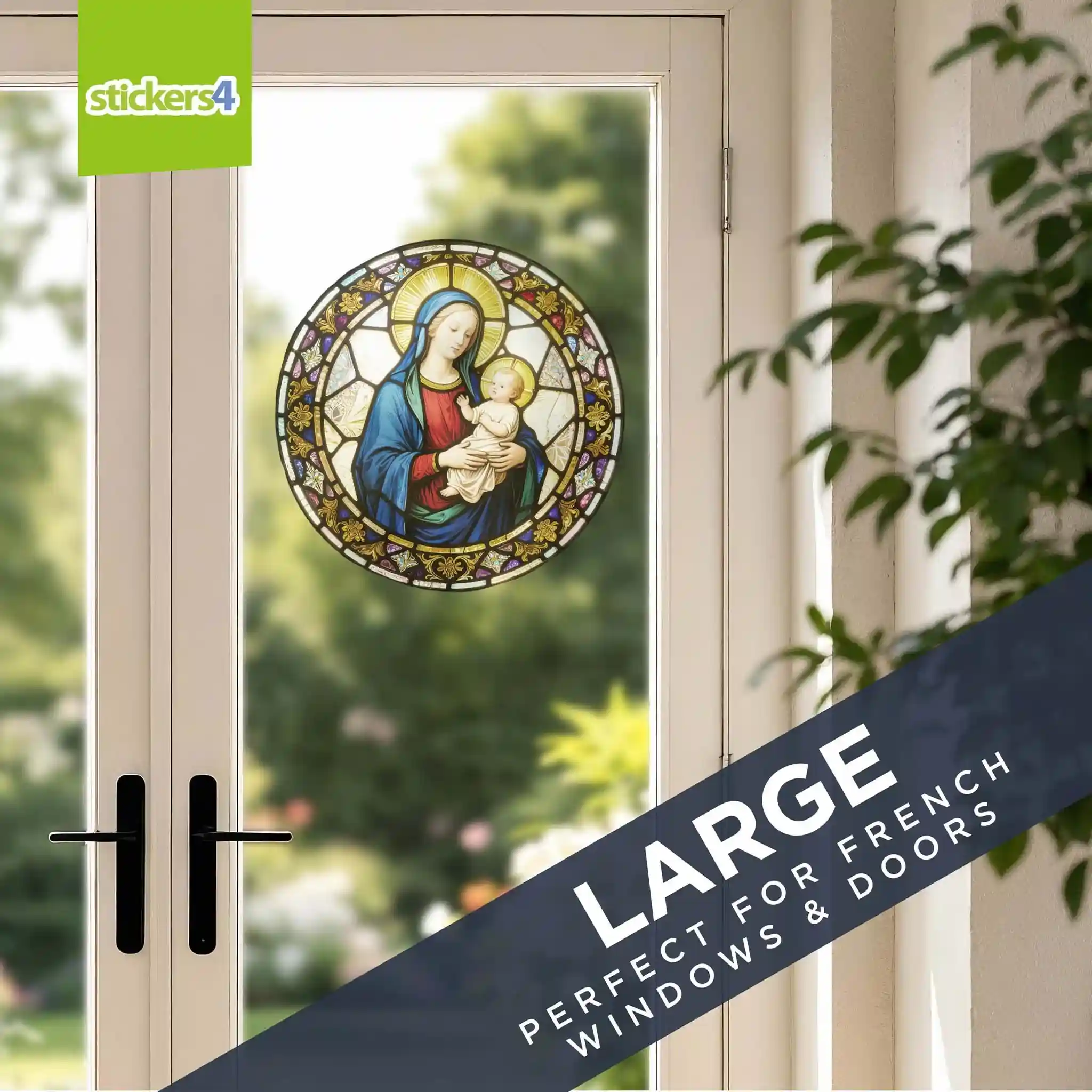 Bring the timeless beauty of cathedral art into your home with this exquisite stained glass Madonna & Child window cling sticker. Inspired by traditional church windows, it captures the serenity of the Virgin Mary and infant Jesus in glowing, jewel-toned colour. Perfect as a religious window sticker or Christian window decoration, this design transforms any window into a stunning focal point.