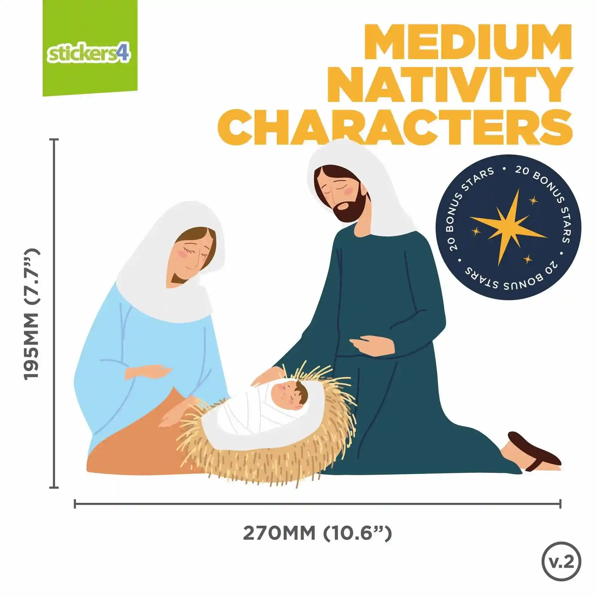 Transform your windows into a breathtaking Nativity scene with Stickers4's premium double-sided static cling window stickers. No more hassle with adhesives or residue. Our exquisite set includes 7 Nativity character stickers that bring the timeless story to life, along with 20 bonus star window clings to add that extra touch of magic.