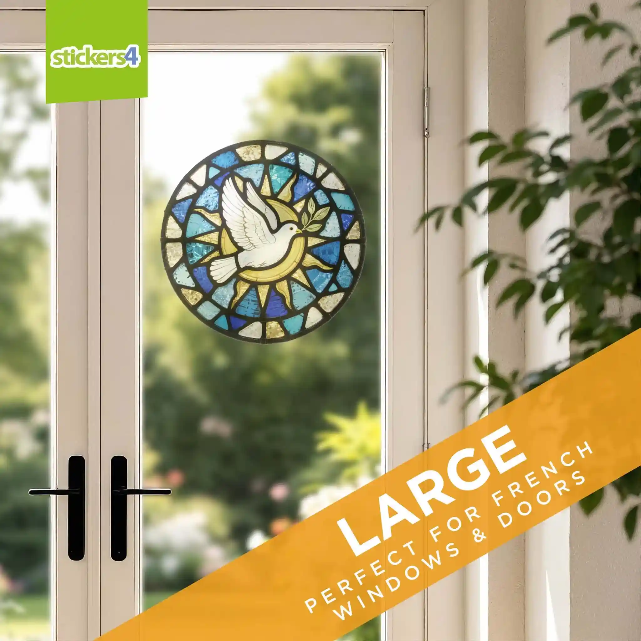 Bring a message of peace and hope to your home with this elegant stained glass Dove with Olive Branch window cling sticker. Featuring the symbolic dove in radiant white and gold tones surrounded by jewel-coloured glass, it recreates the beauty of a traditional church window. This religious window cling adds serenity and colour to any home, shop or church display.