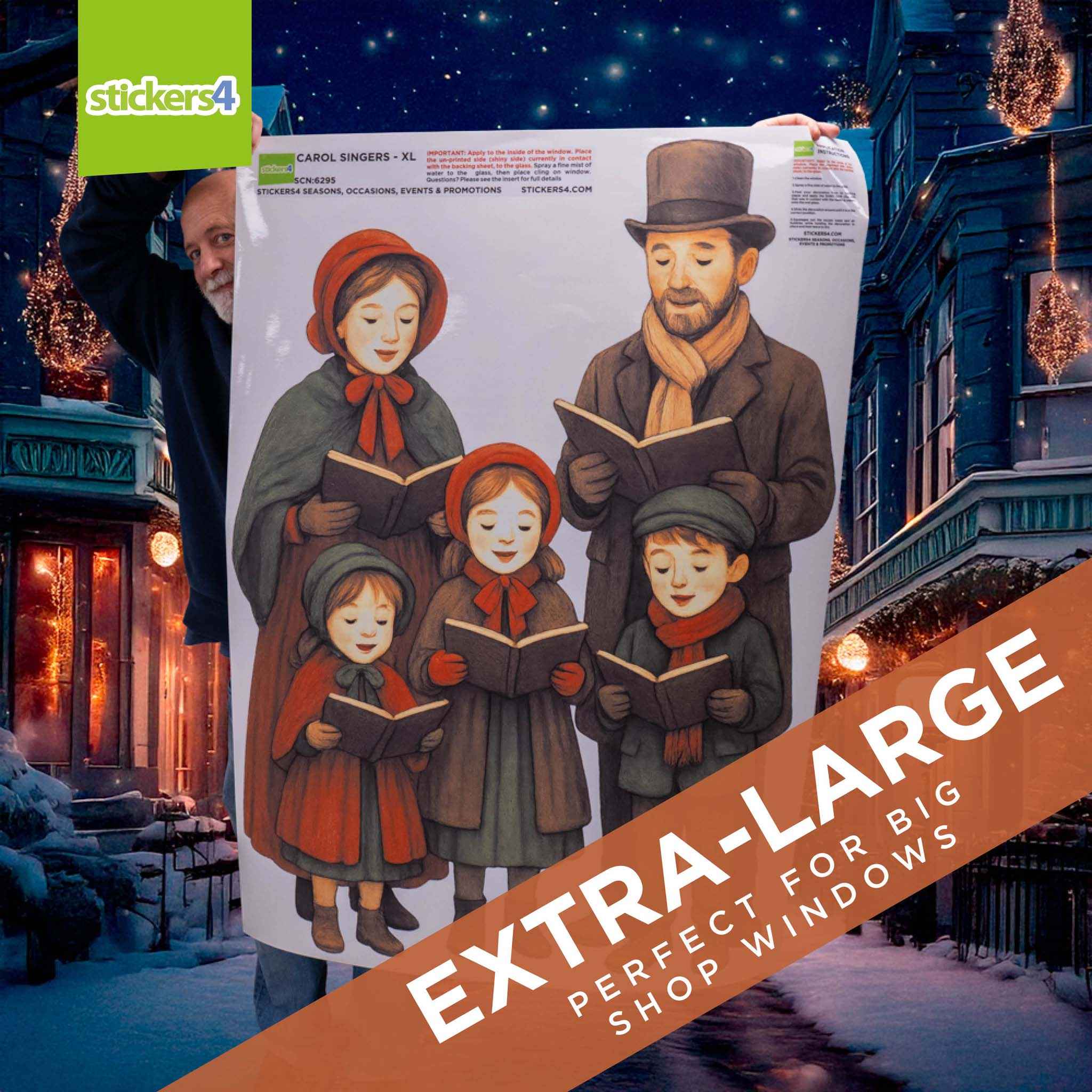 Bring timeless festive charm to your windows with our Victorian Carol Singers Window Sticker. Featuring a family of five traditional carollers in rich winter colours, this design is perfect for shops, schools, and homes wanting to create a warm and nostalgic Christmas display. Available in four sizes, these window clings make a beautiful standalone decoration or the 'Large' & 'Extra-Large' versions can be paired with our Victorian Street Lamp Window Sticker for a complete festive scene.